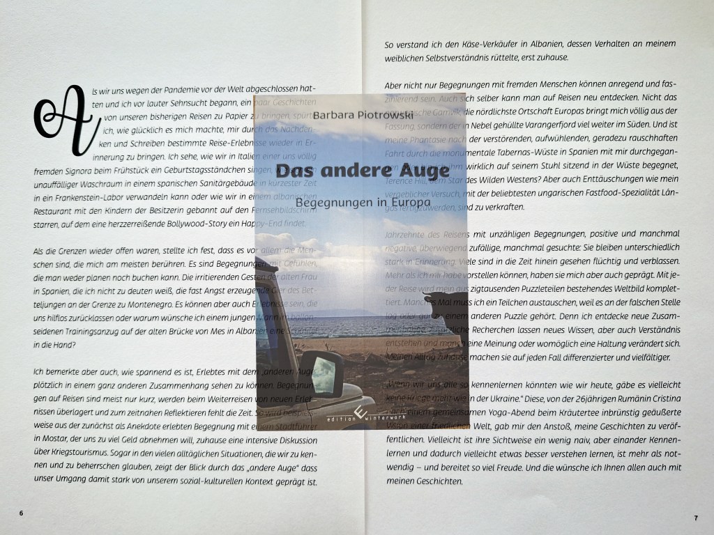 Als wir uns wegen der Pandemie vor der Welt abgeschlossen hatten und ich vor lauter Sehnsucht begann, ein paar Geschichten von unseren bisherigen Reisen zu Papier zu bringen, spürte ich, wie glücklich es mich machte, mir durch das Nachdenken und Schreiben bestimmte Reise-Erlebnisse wieder in Erinnerung zu bringen. Ich sehe, wie wir in Italien einer uns völlig fremden Signora beim Frühstück ein Geburtstagsständchen singen, wie sich ein unauffälliger Waschraum in einem spanischen Sanitärgebäude in kürzester Zeit in ein Frankenstein-Labor verwandeln kann oder wie wir in einem albanischen Restaurant mit den Kindern der Besitzerin gebannt auf den Fernsehbildschirm starren, auf dem eine herzzerreißende Bollywood-Story ein Happy-End findet.